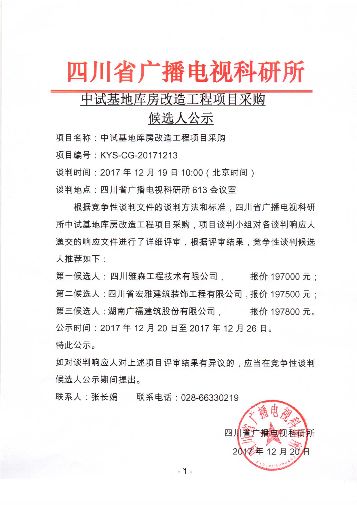 四川省广播电视科研所中试基地库房改造工程项目采购候选人公示