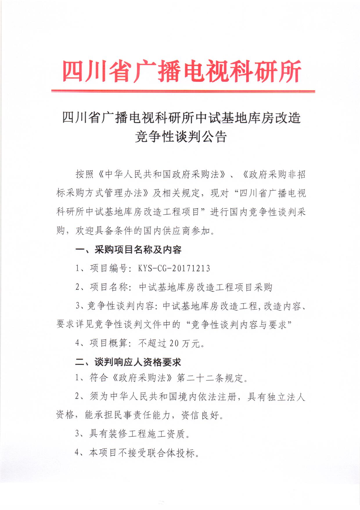 四川省广播电视科研所中试基地库房改造竞争性谈判公告