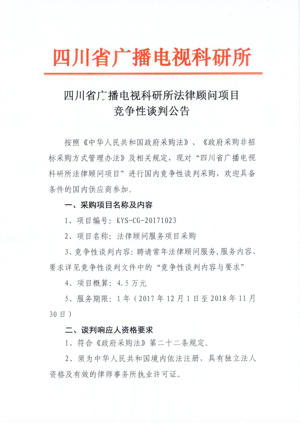 四川省广播电视科研所法律顾问采购项目竞争性谈判公告