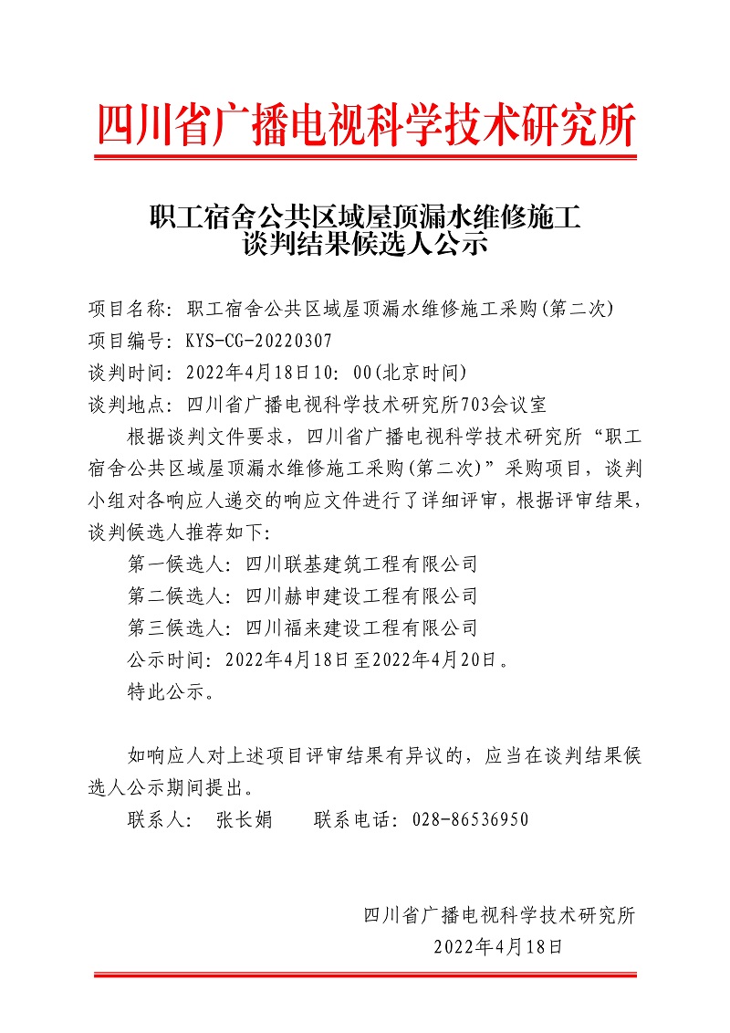 职工宿舍公共区域屋顶漏水维修施工谈判结果候选人公示