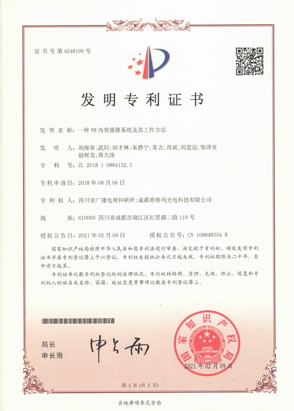 2021年2月9日,国家知识产权局向我所颁发了一项发明专利证书,名称为《一种VR内存摄像系统及其工作方法》。这是我所与成都西格玛公司合作研发的“面向虚拟现实的全景视频摄像系统”的一项科研成果。