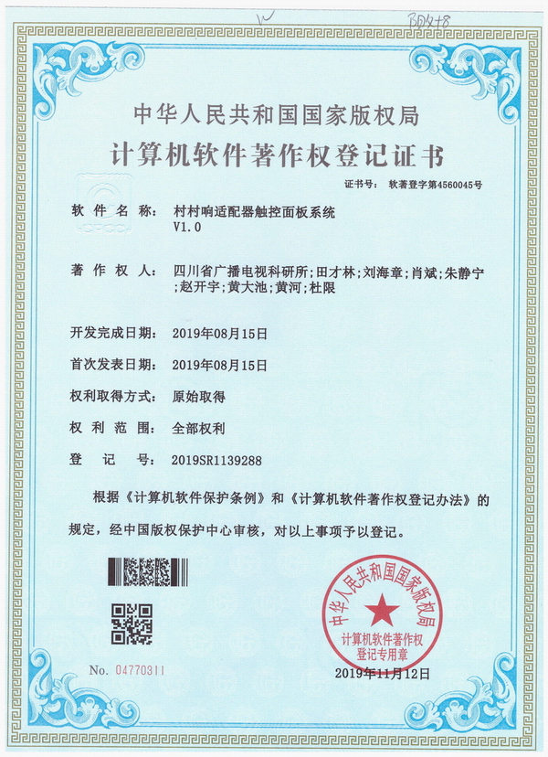 由我所自主研发的“应急广播适配器WEB后台配置系统”“村村响适配器触控面板系统”和“4G回传监测管理软件”3个项目,于2019年11月获得中华人民共和国国家版权局3项计算机软件著作权登记。